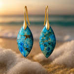 Les boucles d'oreilles Avelina capturent le charme de la plage d'Elafonissi en Crète, où la mer change de couleur en vert. La teinte turquoise éclatante, entrelacée de veines dorées et sableuses, reflète l'eau cristalline qui touche le rivage rose. Ces pierres ajoutent de la lumière et de la profondeur à n'importe quel look.